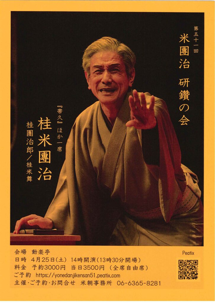 第五十一回 米団治 研鑽の会 桂団治郎桂米団治桂米舞 access_time 2026.04.25 シェア 送る ツイート 公演概要 公演日時 2026年4月25日(土)14時開演(13時30分開場) 場所 動楽亭 出演者 桂 米団治 『帯久』ほか一席 桂 団治郎 桂 米舞 料金 予約 3000 円 当日 3500 円 https://yonedanjikensan51.peatix.com お問い合わせ Tel 06-6365-8281(米朝事務所) « 前へ一覧へ 次へ » 直近の落語会情報 2026年04月07日 あべのハルカス寄席 四月席 林家染吉笑福亭生喬桂三歩笑福亭呂好露の新治 2026年04月07日 染左一門 おひるまえ落語会 林家染左 2026年04月08日 あべのでじゃくったれ 桂雀太