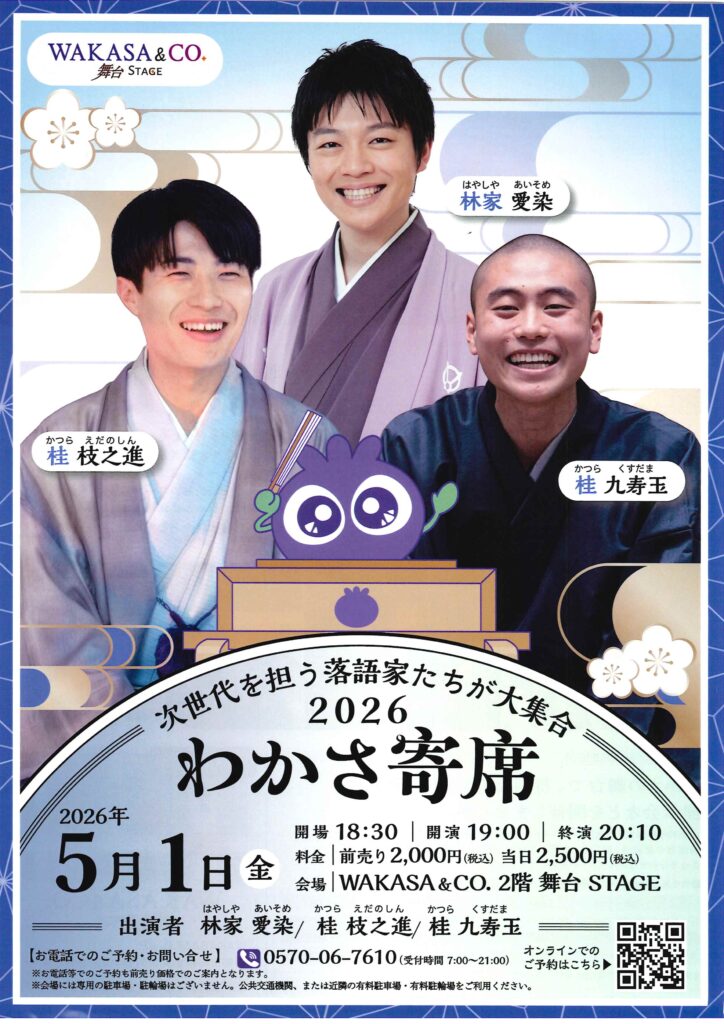 わかさ寄席 桂九寿玉林家愛染桂枝之進 access_time 2026.05.01 シェア 送る ツイート 公演概要 公演日時 2026年5月1日(金)18時開演(18時30分開場) 場所 WAKASA&CO. 舞台STAGE(京都市四条烏丸長刀鉾町22 三光ビル2階) ◇阪急「烏丸」駅または地下鉄「四条」駅20番出口より徒歩3分 出演者 林家 愛染 桂 枝之進 桂 九寿玉 料金 前売 2000円 当日 2500 円 お問い合わせ Tel 0570-06-7610 « 前へ一覧へ 次へ » 直近の落語会情報 2026年04月04日 第16回 西ノ京寄席 露の眞桂慶枝 2026年04月04日 第40回記念 笑びす寄席 桂阿か枝桂雀太桂春蝶 2026年04月04日 第16回 質屋寄席 桂枝曾丸月亭遊真桂八十八月亭遊方笑福亭智丸