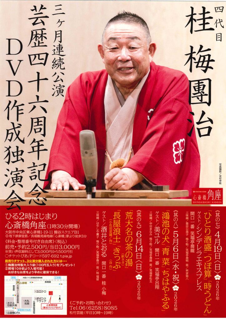 桂梅団治 芸歴四十六周年記念DVD作成独演会 桂小梅桂梅団治 access_time 2026.06.14 シェア 送る ツイート 公演概要 公演日時 2026年6月14日(日)14時開演(13時30分開場) 場所 心斎橋角座(大阪市中央区東心斎橋1-19-11 鰻谷スクエアB1) ◇地下鉄御堂筋/長堀鶴見緑地線「心斎橋」駅より徒歩3分 出演者 桂 梅団治 『荒大名の茶の湯』『長屋浪士』『きっぷ』 桂 小梅 ゲスト:酒井とおる 料金 前売 2500円 当日 3000円 お問い合わせ 《松竹芸能》 ℡ 06-6258-8085 « 前へ一覧へ 次へ » 直近の落語会情報 2026年04月04日 第16回 西ノ京寄席 露の眞桂慶枝 2026年04月04日 第40回記念 笑びす寄席 桂阿か枝桂雀太桂春蝶 2026年04月04日 第16回 質屋寄席 月亭遊方笑福亭智丸桂枝曾丸月亭遊真桂八十八