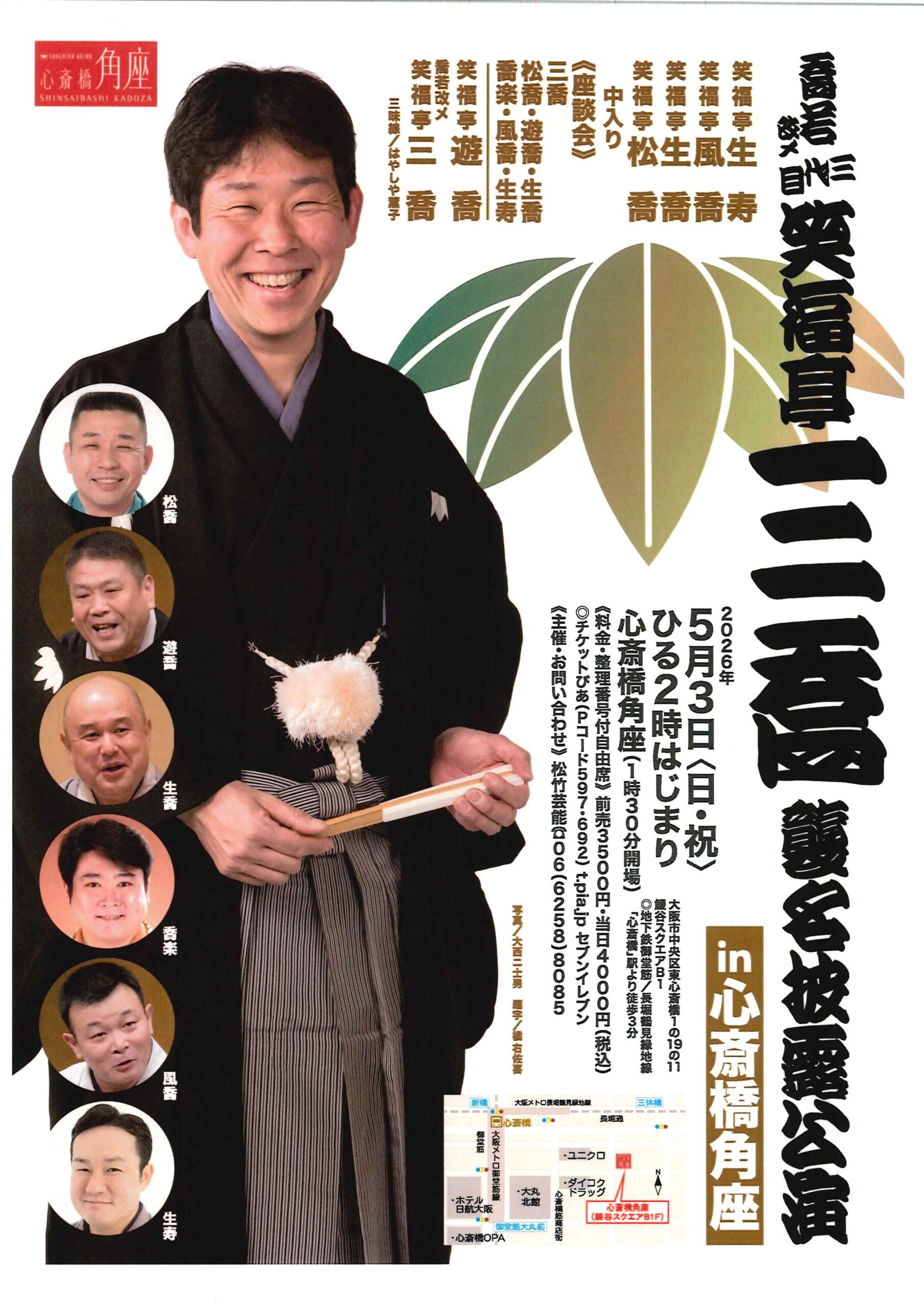 喬若改メ三代目笑福亭三喬襲名披露公演in心斎橋角座 笑福亭風喬笑福亭遊喬笑福亭生寿笑福亭生喬笑福亭喬楽笑福亭三喬(三代目)笑福亭松喬 access_time 2026.05.03 シェア 送る ツイート 公演概要 公演日時 2026年5月3日(日・祝)14時開演(13時30分開場) 場所 心斎橋角座(大阪市中央区東心斎橋1-19-11鰻谷スクエアB1) ◇地下鉄御堂筋線/長堀鶴見緑地線「心斎橋」駅より徒歩3分 出演者 笑福亭 三喬 笑福亭 松喬 笑福亭 遊喬 笑福亭 生喬 笑福亭 喬楽 笑福亭 風喬 笑福亭 生寿 料金 前売 3500円 当日 4000円 お問い合わせ 《松竹芸能》 ℡06-6258-8085 « 前へ一覧へ 次へ » 直近の落語会情報 2026年04月10日 アビリーンで九雀の日 桂九雀 2026年04月10日 新・動楽亭のりょうば 入門十周年スペシャル 桂りょうば桂南光桂弥壱 2026年04月11日 喬若改メ 三代目笑福亭三喬 襲名披露公演 小浜公演 笑福亭三喬笑福亭喬介桂二葉笑福亭松喬笑福亭喬龍