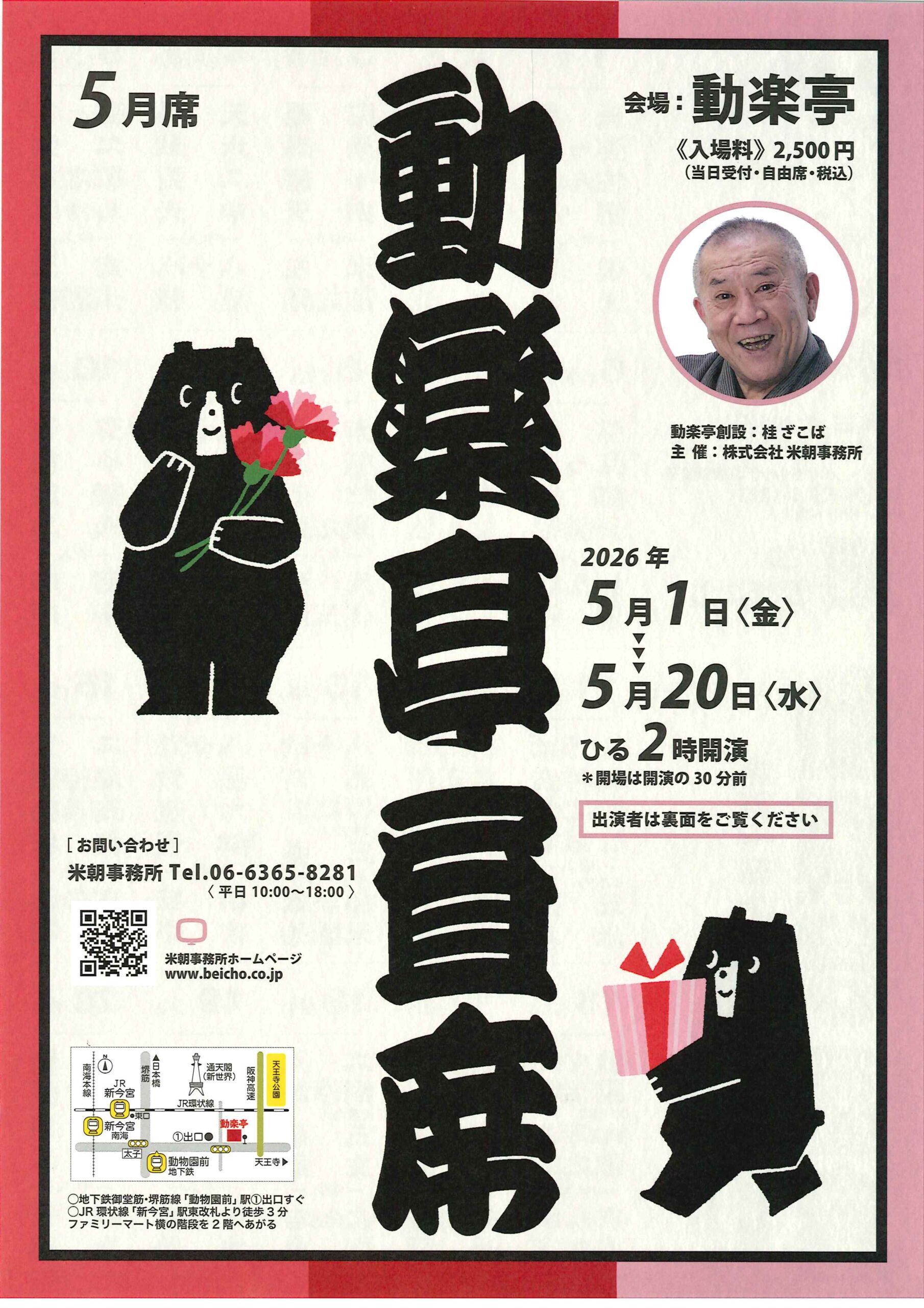 動楽亭 昼席 5月席 桂米二桂団朝桂鯛蔵桂千朝桂小鯛桂弥壱 access_time 2026.05.10 シェア 送る ツイート 公演概要 公演日時 2026年5月10日(日)14時開演(13時30分開場) 場所 動楽亭(大阪市西成区山王1丁目17-6) ♢地下鉄御堂筋線/堺筋線「動物園前」駅①出口すぐ ♢JR「新今宮」駅 東口改札より徒歩3分 ファミリーマート横の階段から2階へあがる 出演者 桂 弥壱 桂 小鯛 桂 鯛蔵 桂 米二 ー中入ー 桂 団朝 桂 千朝 料金 2,500円(当日受付・自由席) お問い合わせ 《米朝事務所》 ℡ 06-6365-8281(平日10時~18時) « 前へ一覧へ 次へ » 直近の落語会情報 2026年04月14日 あべのハルカス寄席 四月席 桂福丸桂雀太桂春若笑福亭三喬(三代目)笑福亭喬介桂源太 2026年04月14日 第十四回 松尾大社やまぶき亭 桂米団治落語会 桂米団治桂米輝桂弥壱 2026年04月15日 第12回 呂好一人勉強会 笑福亭呂好