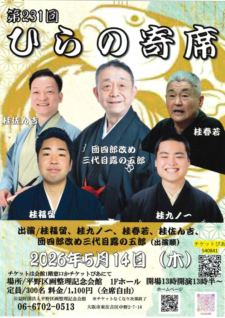 第231回 ひらの寄席 桂春若桂佐ん吉露の五郎桂九ノ一桂福留 access_time 2026.05.14 シェア 送る ツイート 公演概要 公演日時 2026年5月14日(木)13時30分開演(13時開場) 場所 平野区画整理記念会館1Fホール(大阪市東住吉区中野2-7-16) 出演者 桂 福留 桂 九ノ一 桂 春若 桂 佐ん吉 団四郎改め三代目露の 五郎 料金 1100円 お問い合わせ 《公益社団法人平野区画整理記念会館》 ℡06-6702-0513 « 前へ一覧へ 次へ » 直近の落語会情報 2026年04月28日 あべのハルカス寄席 四月席 桂三実桂枝曾丸笑福亭枝鶴林家染左笑福亭呂好笑福亭銀瓶 2026年04月28日 毎月10日間‼連続講談千鳥亭 森乃石松 2026年04月29日 としごの会 vol.45 笑福亭智丸桂かかお桂弥っこ